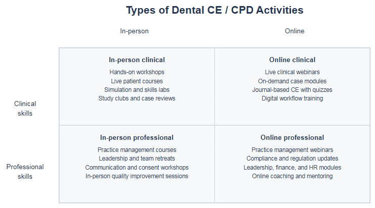Dental continuing education (CE) and continuing professional development (CPD) are essential components of modern dental practice worldwide. Whether you are a dentist, dental hygienist, or another dental care professional, it is likely that your regulatory body expects you to engage in structured learning throughout your career.